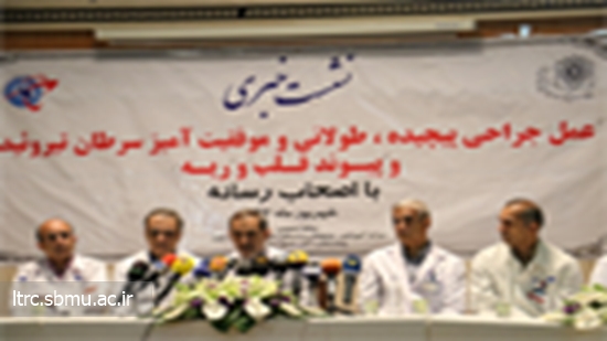 نشست خبری در خصوص "عمل جراحی پیچیده، طولانی و موفقیت آمیز سرطان تیروئید"، پیوند "قلب" و "ریه" با اصحاب رسانه شنبه 25 شهریور ماه با حضور دکتر علی اکبر ولایتی رئیس بیمارستان دکتر مسیح دانشوری ، تیم جراحان، تیم بیهوشی و تیم پیوند قلب و ریه بیمارستان دکتر مسیح دانشوری در سالن همایش امیرکبیر این بیمارستان برگزار شد.